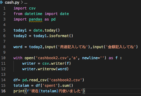 とりあえず、日付、用途、金額を入力して、ファイルに書き込むことはできるようになりましたが、日付を入れるのが面倒です。