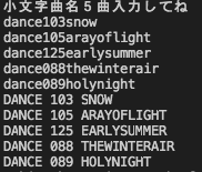 あとはYoutube用に曲名を大文字にするコードで数字の前後に空白を入れたいがために正規表現だとかいろいろと調べましたが、曲名中の2桁数字にはあらかじめ0を入れて(地味に面倒)3桁にしてから空白をその前後にいれるということで落ち着きました。