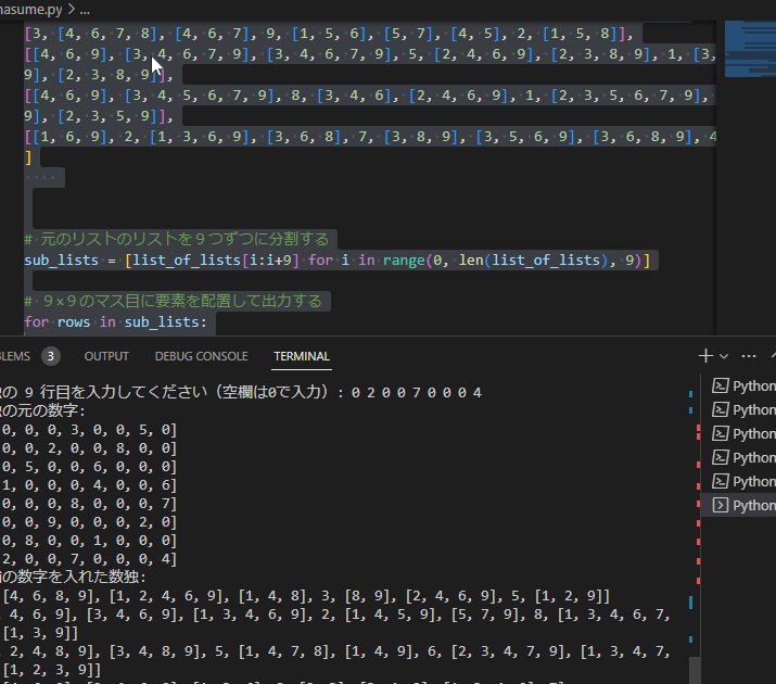 そして、どうしても解けない数独のためにまたPythonで候補の数字を入れていますが、