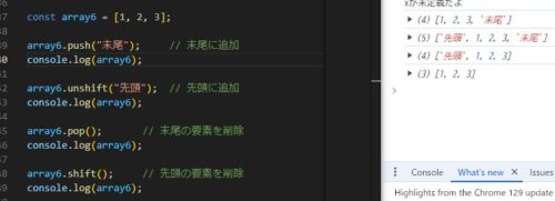 末尾要素の追加(push)、削除(pop)、先頭要素の追加(unshift)、削除(shift)要素を追加する push と unshift は、追加したい要素を引数で渡す