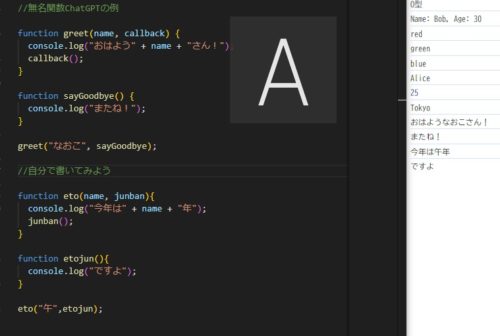 コールバック関数というのがよくわからず再度聞いたりして、ああなんか処理したいことがあって、すぐには実行しないで何か処理した後に実行したい時に使うのかなあと漠然とした理解をしました。