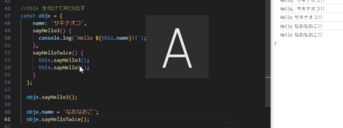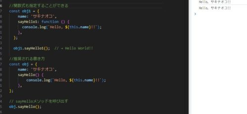 関数とメソッドの違いとして、メソッドでは同じオブジェクト内のプロパティの値が使える。使いたいプロパティ名の前に this. と付ける。同様に、同オブジェクト内の他のメソッドも this を付けて呼び出せる。