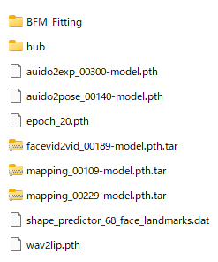 gfpgan.pth: https://github.com/TencentARC/GFPGAN から取得auido2exp.pth,auido2pose.pth,mapping_00109-model.pth,facevid2vid_00189-model.pth: https://huggingface.co/Winfredy/SadTalker/tree/main